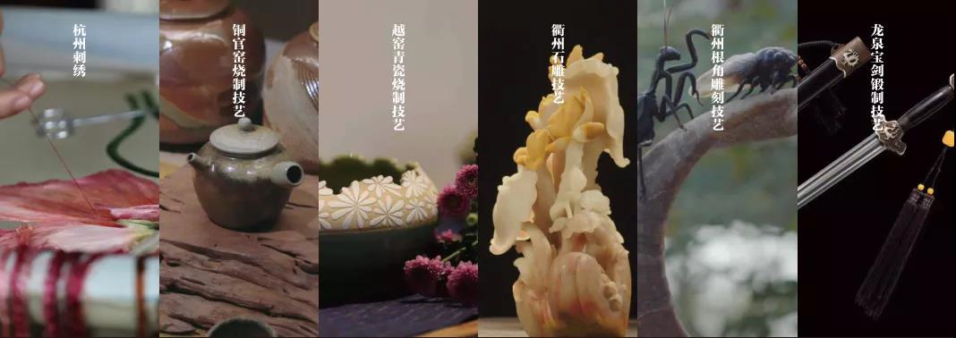 展示杭州织锦技艺、萧山花边制作技艺、湖州风筝制作技艺、湖州羽毛扇制作技艺、竹刻技艺、南湖画舫制作技艺、武义大漆髹饰技艺、永康钉秤制作技艺、龙泉青瓷传统烧制技艺、木拱桥传统营造技艺、船模制作技艺、象山竹根雕技艺、古琴制作技艺、衢州白瓷烧制技艺、绍兴花雕制作工艺、嵊州竹编、一根藤制作技艺、台绣技艺、乐清细纹刻纸技艺、瓯塑技艺、传统木船制造技艺共22项国家、省、市、区非遗项目。