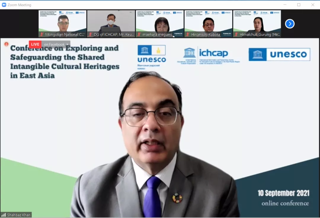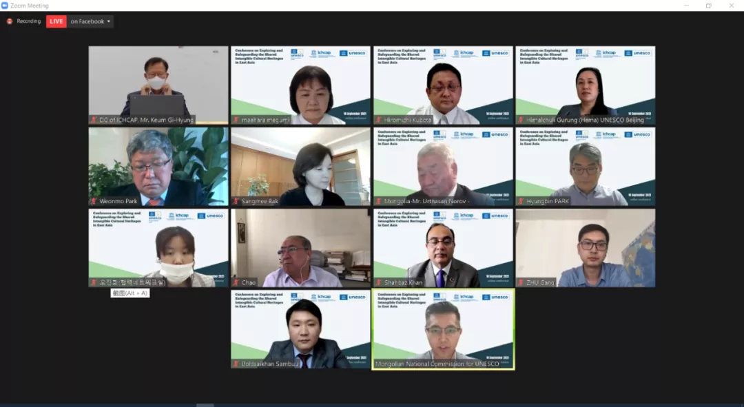 在联合国教科文组织2003年《保护非物质文化遗产公约》的框架下,联合国教科文组织北京代表处和联合国教科文组织蒙古国全国委员会,与教科文组织亚太区域非物质文化遗产国际信息和网络中心(ICHCAP)合作,于2021年9月10日组织了在线的“探索和保护共享非物质文化遗产东亚会议”。联合国教科文组织北京代表处驻华代表Shahbaz Khan教授致开幕词,ICHCAP总干事Keum Gi Hyung先生和联合国教科文组织蒙古国全国委员会秘书长Boldsaikhan Sambuu先生致开幕词。