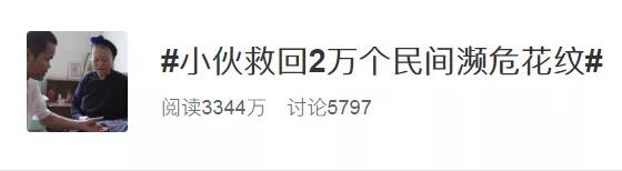 与他相关的微博话题#小伙救回2万个民间濒危花纹#目前已有3344多万的关注,他的事迹也受到了共青团、央视网等媒体的关注,得到了广大网友的纷纷称赞。