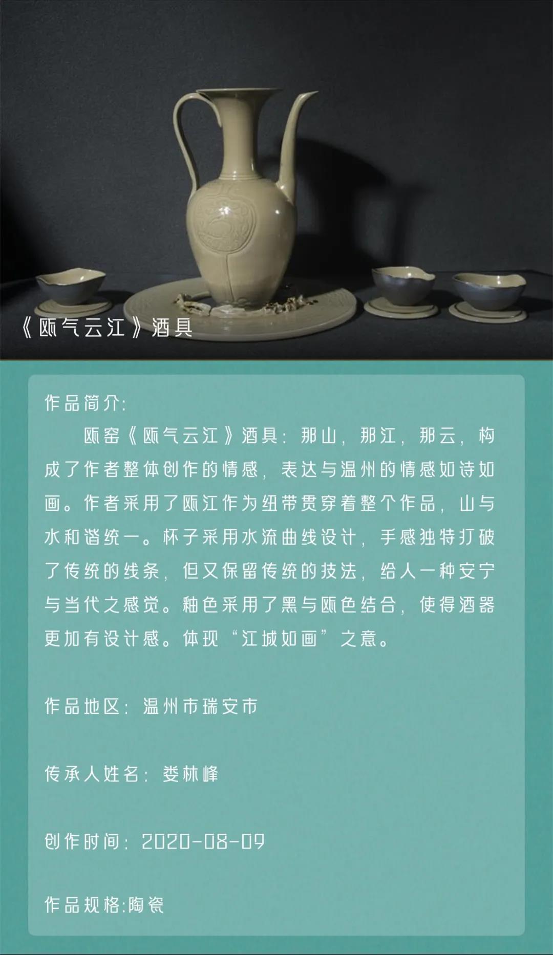近日,由文化和旅游部非遗司作为指导单位、中国非物质文化遗产保护协会支持,中华艺文基金会资助、浙江省文化和旅游厅、杭州市人民政府主办的2021年薪传奖展评活动落下帷幕,并公布评选结果,我市瓯窑项目温州市级代表性传承人娄林峰的作品《瓯气云江》酒具荣获薪传奖传统工艺大展优秀奖。