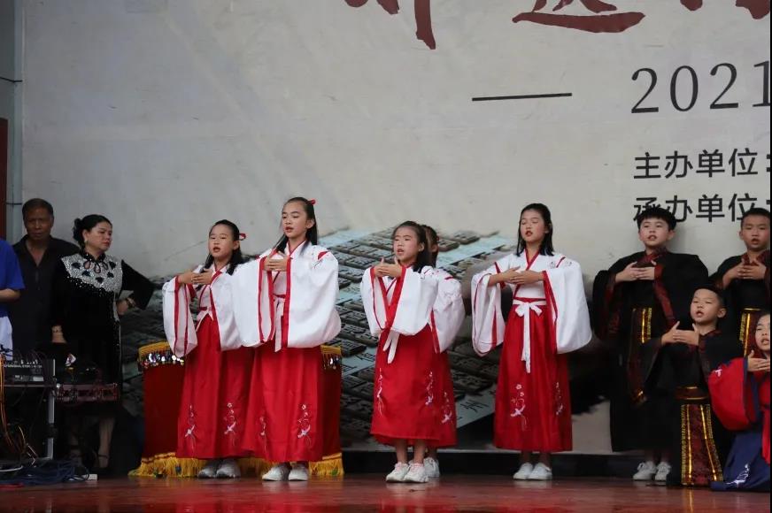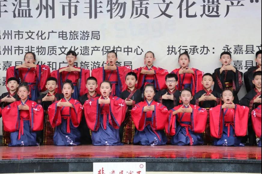瓯北一小的四(3)班、四(4)班同学们带来的节目《诗经 鹿鸣》,展示了古人在宴会上迎客敬客的礼仪之道和欢乐祥和的宴乐气氛,更是一小师生向非遗艺人们的欢迎之礼。