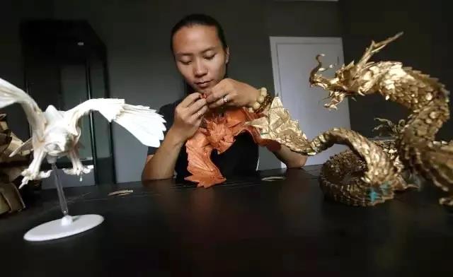 这件雄伟腾飞的中国巨龙作品,也是秦坤的代表作之一。巨龙盘旋的姿态如登青天,形状逼真,气势逼人。巨龙是由一张两米长的纸折成,身躯上密布1400多个鳞片,每个鳞片大小不超过两毫米,折成一个鳞片至少需要7分钟,整件作品耗时了一个多月才完成,细节的展现堪比精雕作品。