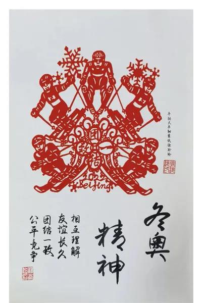 经过前期的构图、裁剪、装订、剪纸等流程,一幅幅栩栩如生的剪纸图案跃然纸上,中国传统文化与冬奥元素巧妙结合,让大家在感受剪纸文化魅力的同时,也能更多地了解冬奥、走进冬奥、助力冬奥。其中,以“冬奥精神”为主题的剪纸作品格外引人瞩目。这幅作品中,形态各异的五名滑雪运动员将“团结一致”四字围在中间,几片雪花飘在运动员周围,洋溢着冰雪运动的氛围,作品下方还有艺术字体的“2022 Beijing”字样,不仅应和了太平钿剪纸有方有圆的传统,更生动形象地展示了运动员在滑雪过程中的矫健身姿和一致向前,为国争光的团结精神。