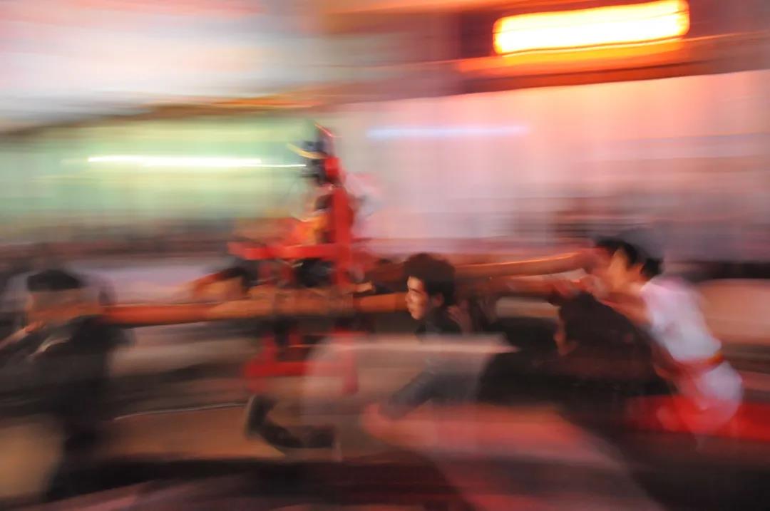 五更福道场有列队的晏公爷阵容以及参加拔五更的人员,更有人头攒动的民众,可谓水泄不通。拔五更的,则跃跃欲试、呈“箭在弩上”的态势,时不时地高喊“跑啊”,似乎在壮胆;观瞻人群也会响应,似乎在闹着玩;首事们会不停应声而喝斥“未啊未啊,炮还未响……”以摁住他们动身的冲动,于是这款特殊的两股势力时不时相互叫板,此起彼伏,而道场里的禠公的铃当声,则显得沉闷多了……当用于统一东、西两个队伍出发时间的铁铳声,以巨响撕裂夜空那一刹那,早已摁捺不住激情的队伍,便哗一声抬着晏公冲入了小巷,等候在前方的高灯笼、香斗、虎头牌也疾速前冲,四扇(开路先锋的角色)、三扇、二扇、大扇,大纛(旗),接踵而至,浩浩荡荡,边上的民众喊出“顺啊顺啊……”一时间呼喊声、吹号声、敲锣声交汇在一起……壮观难以尽述。