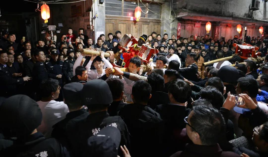 晚10时许,首事们便会将东西两殿八尊老爷的盔袍脱下,改此前的銮轿为硬轿。随后,晏公爷“落公馆”,意味着即将进入驱除恶魔的战备状态。此时,晏公爷前些时日的笑脸似乎已不再见,映入民众眼帘的是双目怒睁的一脸严肃,这时,城内的大街小巷全无早些时候看闹灯的热闹欢乐的氛围,而是渐显安静,莫名地凝重了起来。