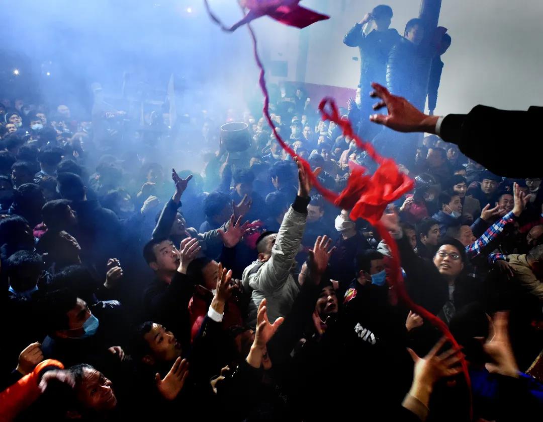 此后很快就进入抢杠环节。寒冷的深夜,人群冒出的热气,在上方形成了明显的烟团……