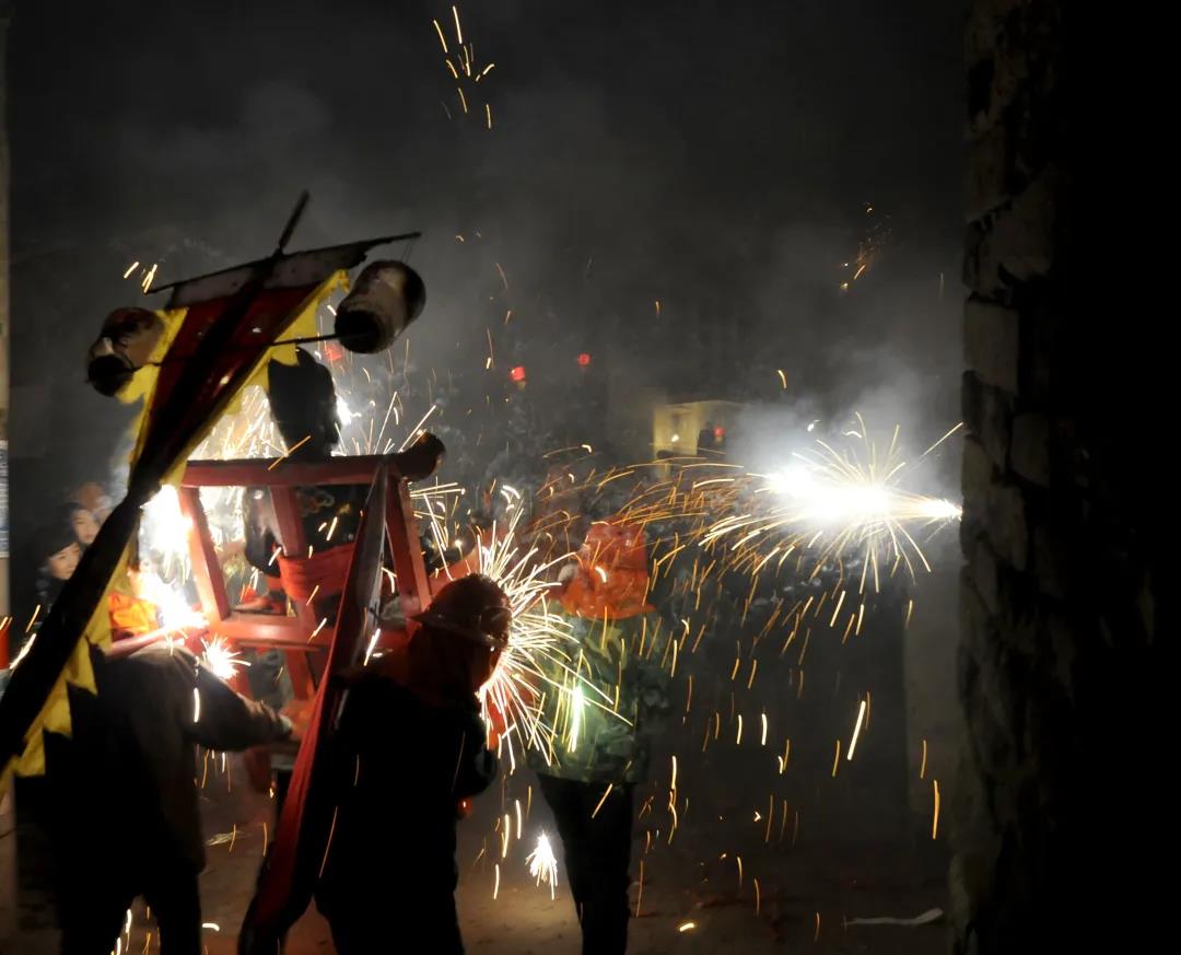 到了晚间六七时,晏公最后一次巡游全城,也是堪称蒲城一年中“火树银花不夜天”的时刻。轿杠已在前一晚被抢走,首事们只好协力用肩顶着坐有晏公的轿子上街。他们用旧衣服、毛巾甚至安全头盔等将自己包起来,以免被烟花烫伤——因为当晚的信众,会将缠绕有鞭炮的长竹竿架在晏公爷身上燃放,或是用土制烟花毫不顾忌地向晏公身上发射……这一晚,胜利的喜悦人神共享,这一晚,英勇的众神与民同乐。他们以这种狂欢的方式庆贺,也以这种“虔诚”的方式祈福……这是多年以前的盛景。如今都改用礼花了。