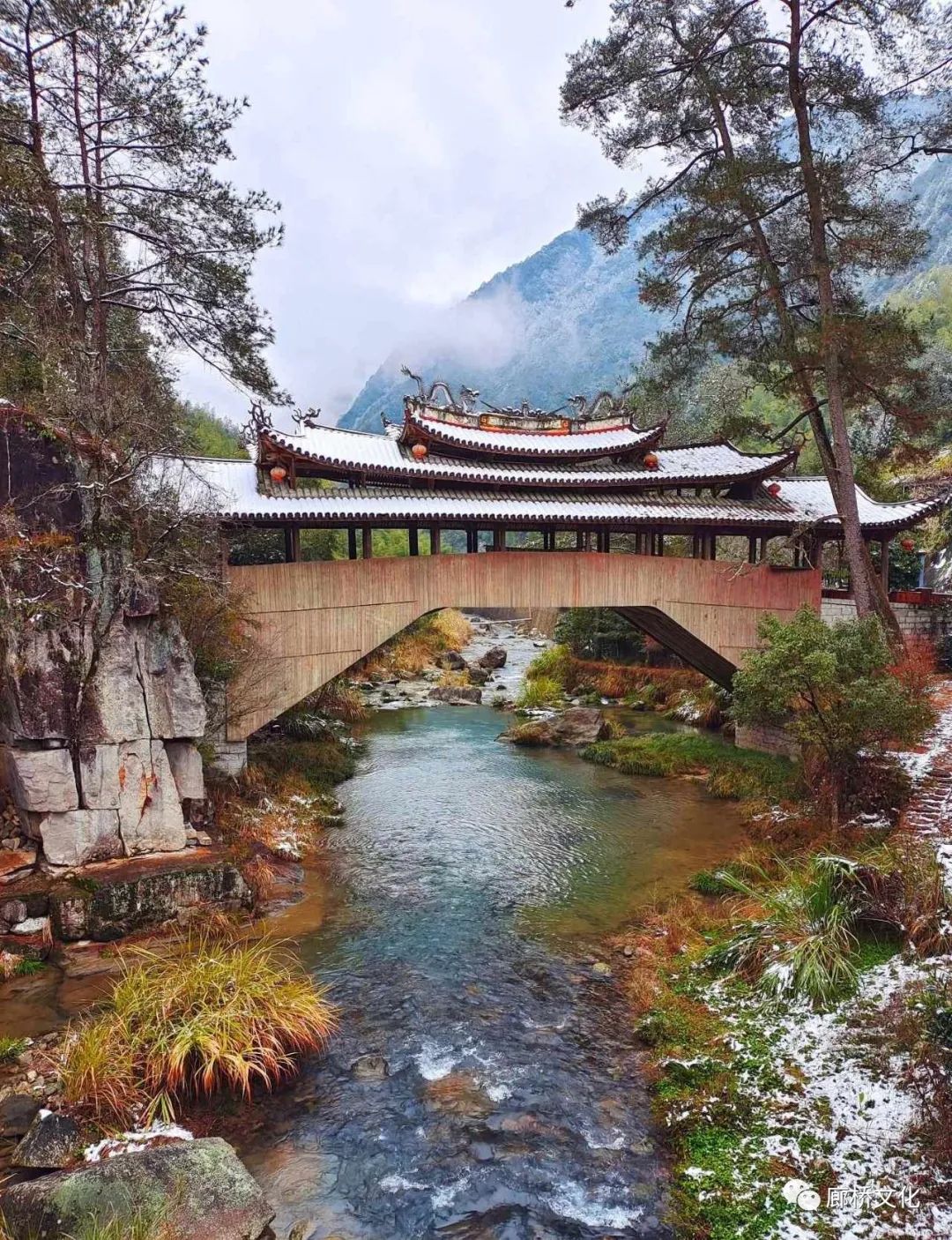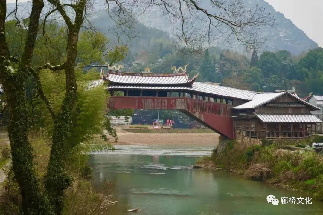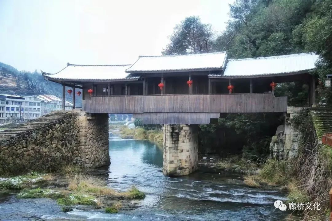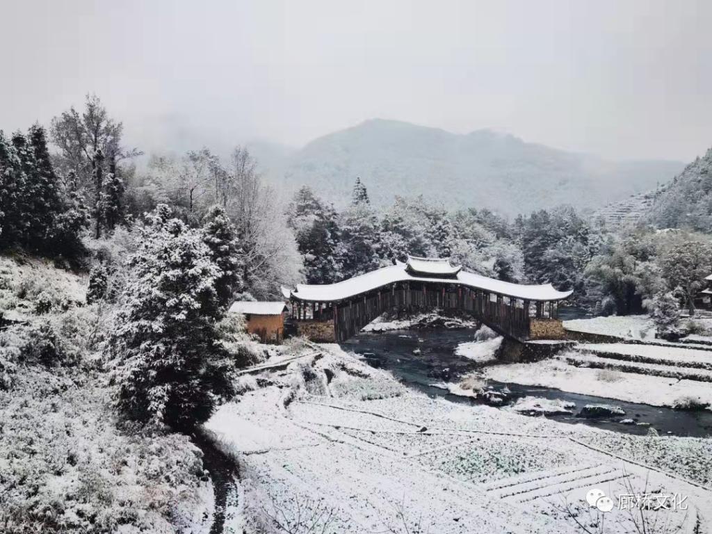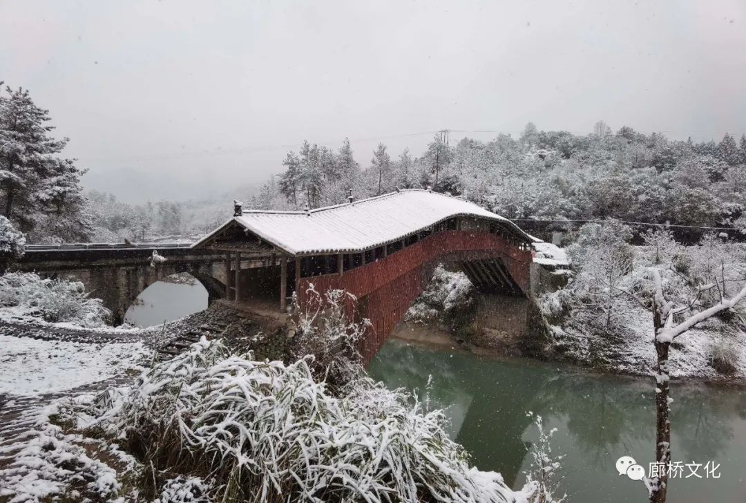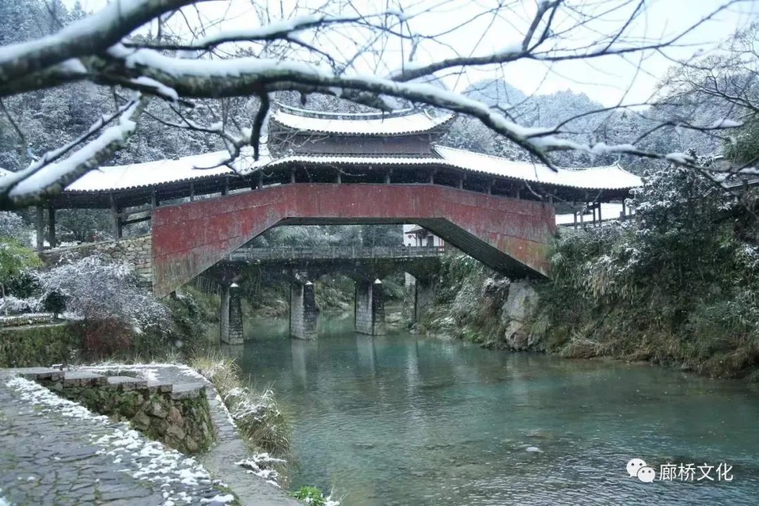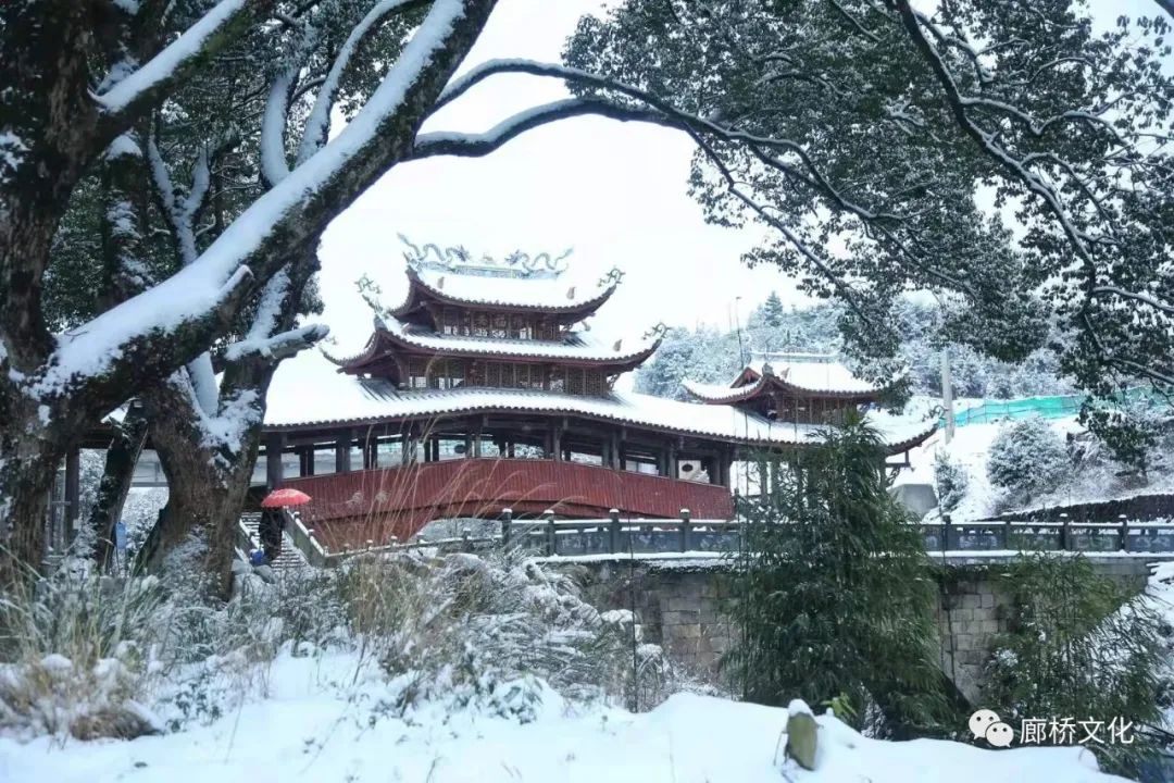 在大雪营造的绝美画卷中,泰顺廊桥尤为惊艳,白雪和朱红的桥身相互映衬,展现了浓郁的中国风。