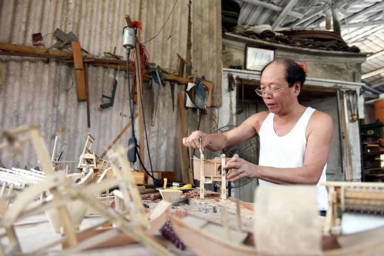 乐清首饰龙俗称“首饰龙灯”“龙船”,起源于明朝末年,是乐清传统工艺美术灯彩品种之一。乐清首饰龙制作技艺集百工之长,制作工艺繁琐复杂,工程庞大,包含木工、钳工、油彩、竹编、纸扎、灯彩、刻纸、服装设计、人物雕塑以及仿古建筑等。林顺奎是编扎、刻纸等的行家里手,精通木工、钳工等,他运用各种大大小小的工具,将乐清首饰龙打造成具有山海特色、充满生活情趣和文化韵味的工艺美术品,让它成为瓯越文化的艳丽奇葩。