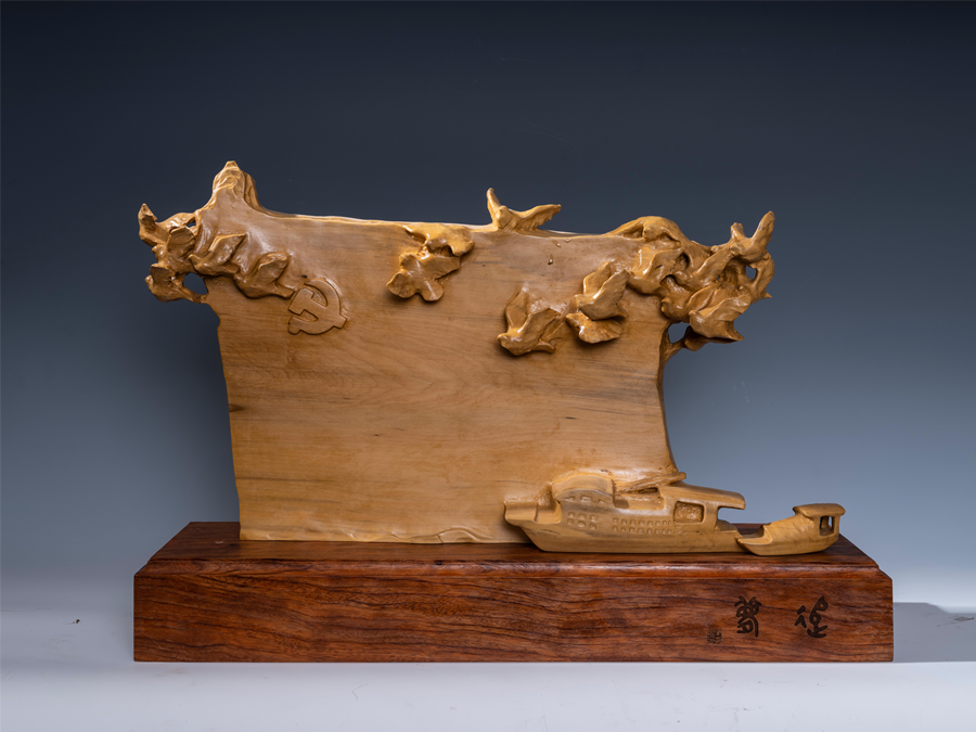 黄杨木雕作品《追梦》以一红船、党旗、鸽子为创作原素,表现全国各族人民在中国共产党的带领下,为实现民族复兴,在百年奋斗历程中走中国道路、弘扬中国精神、凝聚中国力量,坚毅前行的豪迈气概。作品以雕塑的设计形式、现代的雕刻手法,通过视觉化的艺术语言,形象展示我们对于梦想的不懈追求,百年追梦取得了伟大成就,昭示中华民族伟大复兴的光明前景。