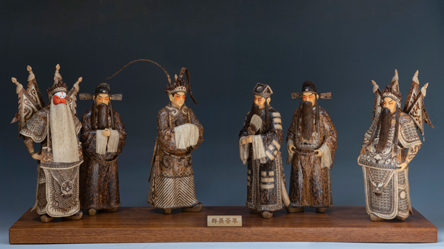 竹壳雕作品《群英荟萃》以三国戏剧人物舞台形象进行改编创作,利用竹壳的肌理和色泽,浅中深三色,可贵的天生花纹、无规则的斑点,综合传统民间雕塑、剪刻、绘画技法,因材施艺,将竹壳的个性和特性有效的体现出来。作品借古喻今,表达了全人类通力合作、出谋划策、不分彼此,敢于奉献精神,众志成城,共同对付困难险阻,才能勇敢地克服困难、战胜困难而取得胜利!