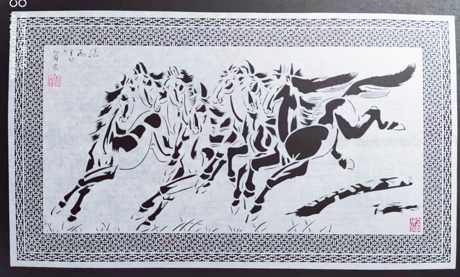 细纹刻纸作品《腾飞》,映入眼帘的是气势磅礴、四蹄生风的骏马奔腾在一望无际的原野上。作者有数十年的雕刻功夫,刀法细腻,技法娴熟,刻刀下的骏马仿佛被赋予了生命,即将越出纸面,奔腾而来,显示出一股巨大的力量,那强劲的铁蹄,仿佛响着“嗒嗒”的蹄声。