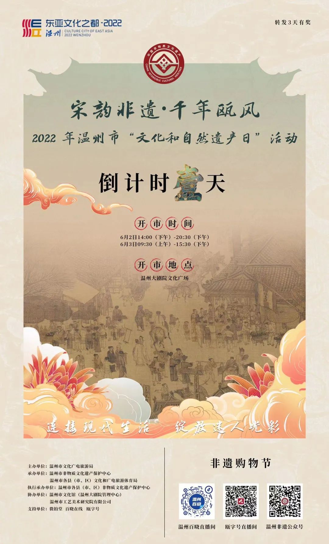 6月2日—3日,欢迎广大市民来到温州大剧院文化广场,穿上汉服,逛逛集市,一起穿越时空,体验“宋韵非遗·千年瓯风”,还有更多精彩等您现场解锁。