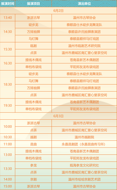 喜欢戏曲类节目的市民们更不要错过,在集市期间还将有永嘉昆曲、瓯剧、提线木偶戏、碇布龙、布袋戏等非遗项目展演。