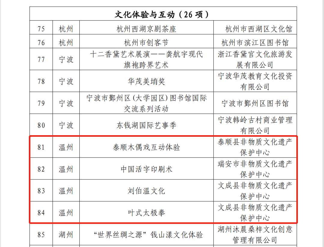 近日,浙江省文化和旅游厅公布了第一批浙江省公共文化国际交流项目名单,泰顺木偶戏,瑞安中国活字印刷术、文成刘伯温文化、文成叶式太极拳四项非遗收录其中。