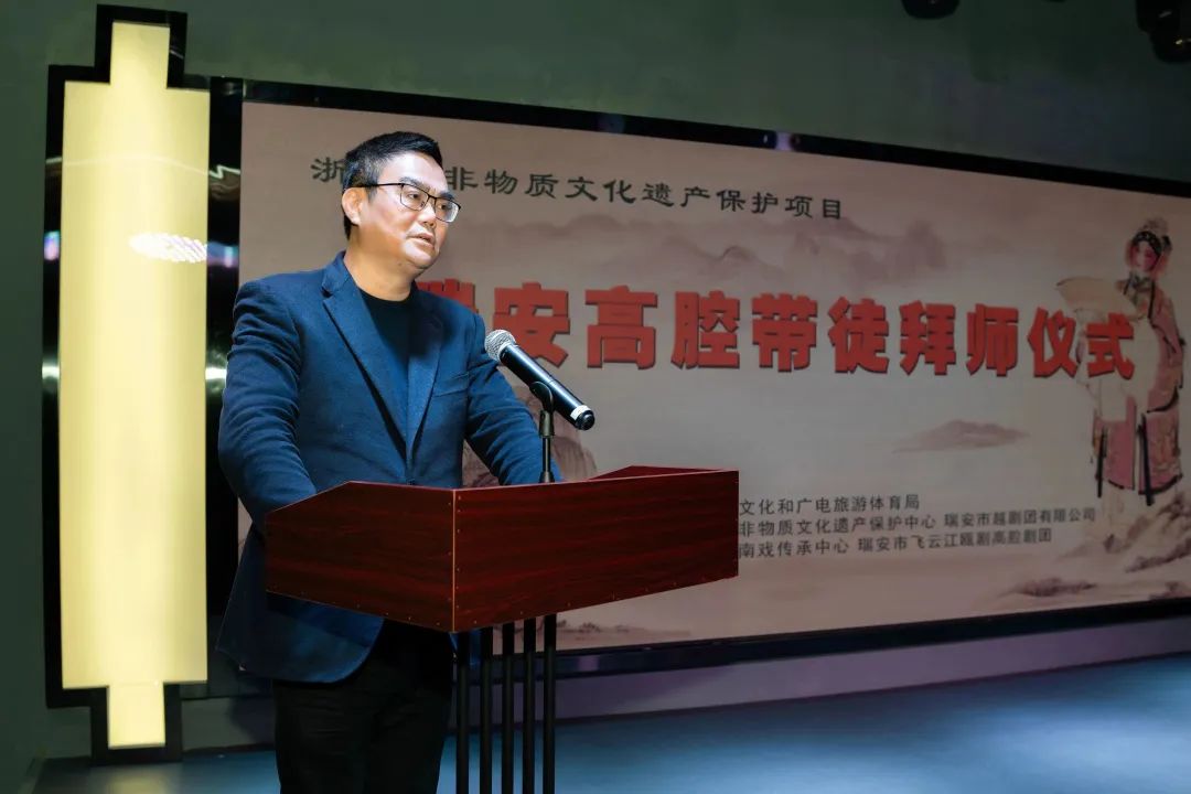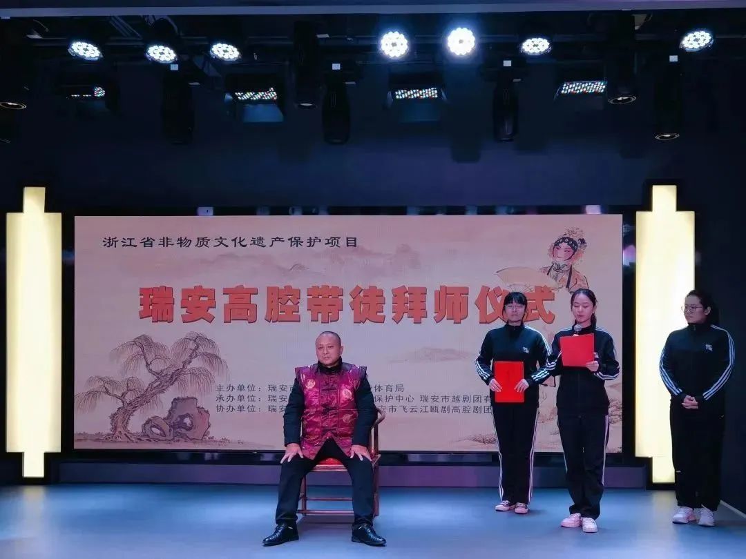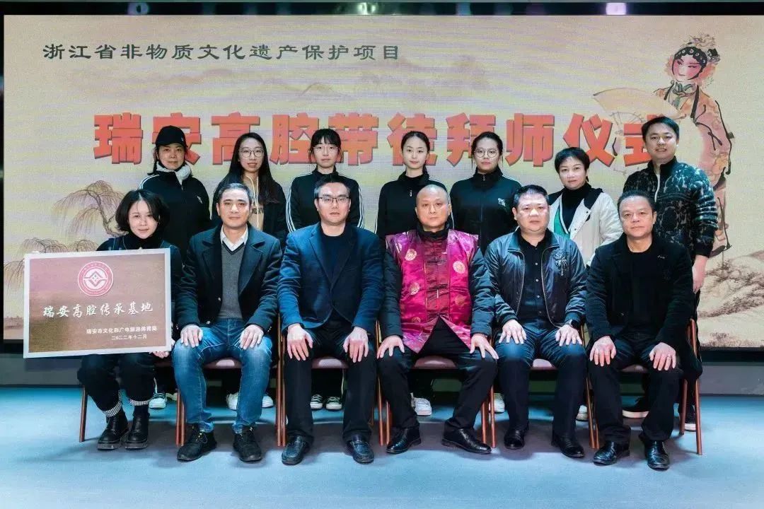 冬日渐寒,但戏曲薪火相传的热情正旺。为弘扬中国优秀传统文化,加强濒危传统戏剧——浙江省级非遗项目“瑞安高腔”的保护和传承,12月8日,由瑞安市文化和广电旅游体育局主办,瑞安市非物质文化遗产保护中心、瑞安市越剧团有限公司承办的瑞安高腔带徒拜师仪式在瑞安市南戏传承中心隆重举行。瑞安市文化和广电旅游体育局局长胡晓秋、副局长林华弟以及文化遗产科科长陈奇出席拜师仪式。