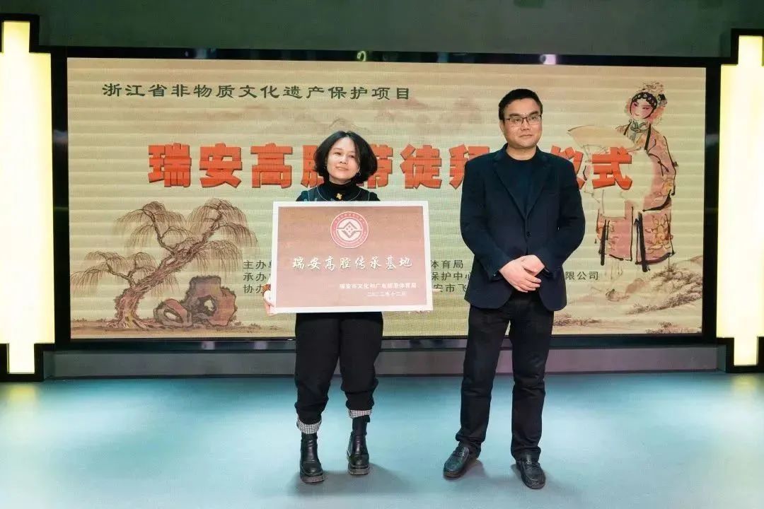随后,瑞安市文化和广电旅游体育局局长胡晓秋为瑞安市越剧团颁发“瑞安高腔传承基地”牌子,以此搭建瑞安高腔传承人与瑞安市越剧团强强联手的纽带,齐心协力推进瑞安高腔传承和发展工作。胡晓秋局长表示,此次拜师仪式顺应了“天时”“地利”“人和”,希望传承人老师积极开展带徒授艺工作,年轻学徒做到勤学苦练,基地充分发挥培训传承功能,同时守正创新,繁荣戏曲文化表演与创作,把传承基地打造成戏曲爱好者的交流平台和展示平台,倾情讲好瑞安故事,着力推动瑞安戏曲事业繁荣发展。