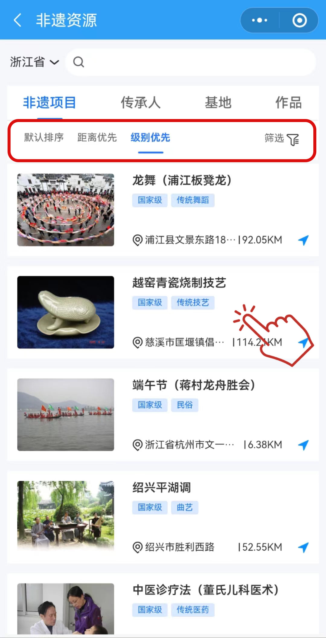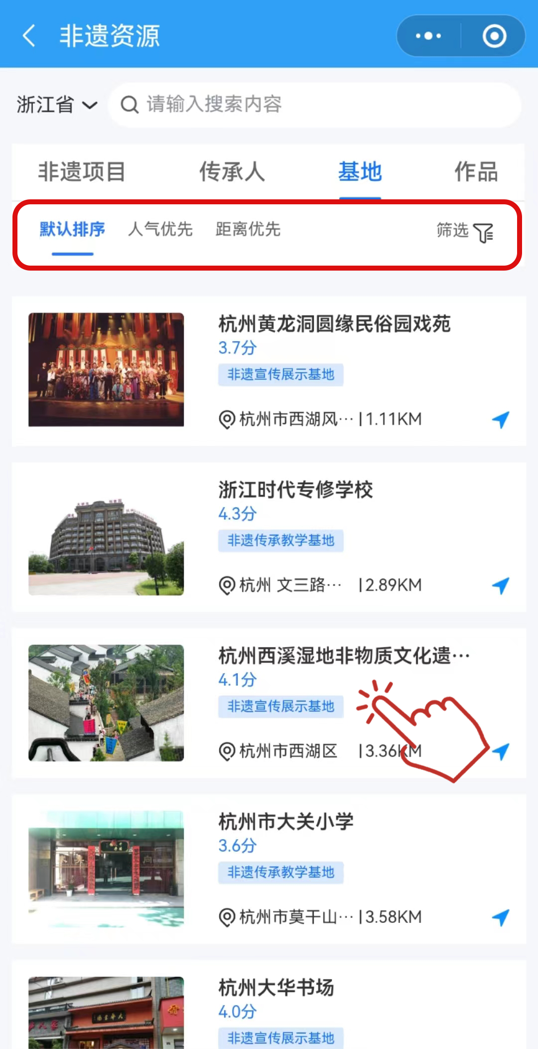 进入“非遗资源”→“基地”,点开是搜索栏,可以输入相关信息进行精确搜索。下方显示的基地列表为默认排序,可选择“人气优先”或“距离优先”,想知道热度最高的基地?点击“人气优先”;想知道离你最近的基地是什么?点击“距离优先”;另外,也可以根据级别和类别等条件筛选更为精准的范围。