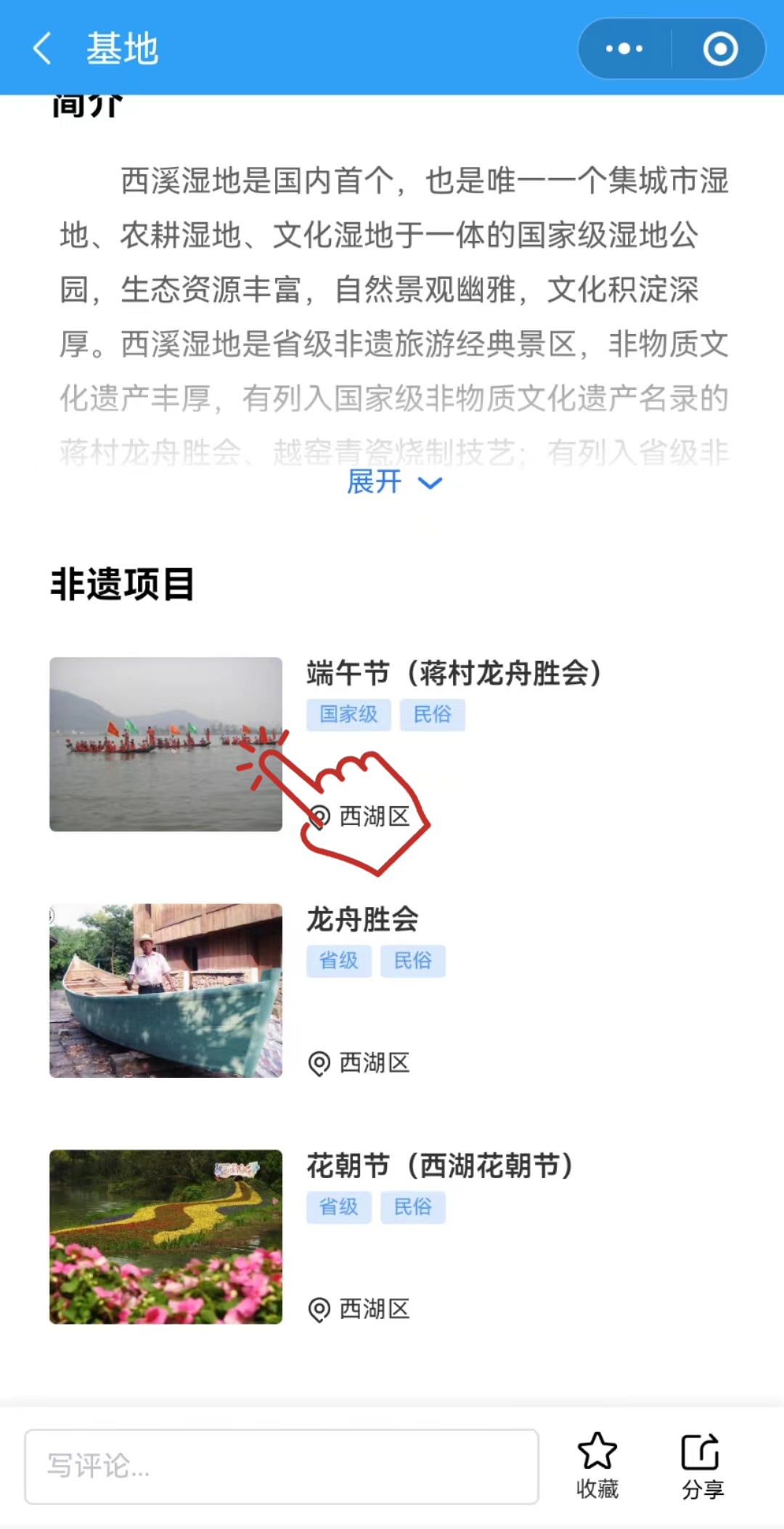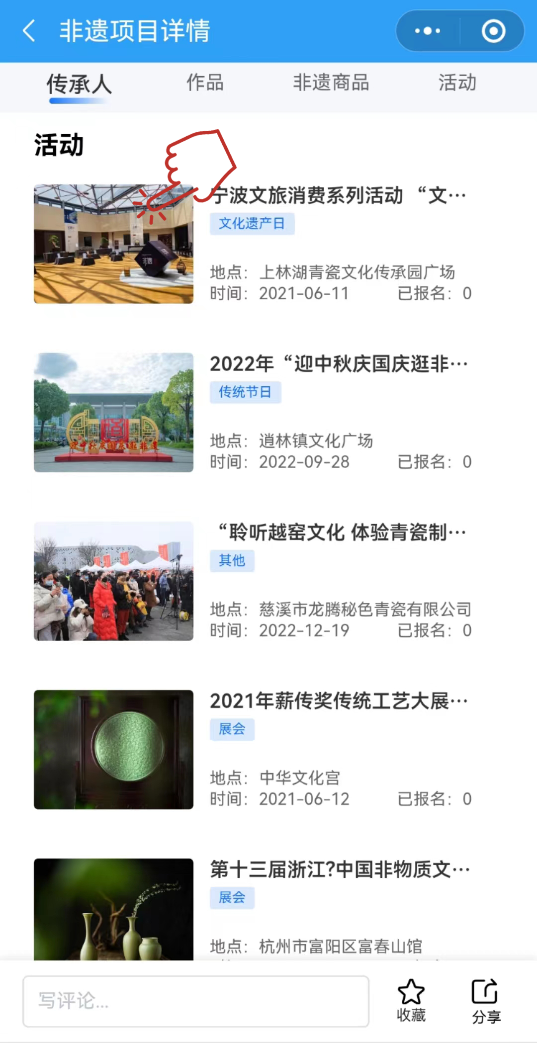每个项目条显示包含项目名称、图片、级别、类别、地址、距离信息,点击该项目条进入之后则是项目的完整介绍,有所属地区、保护单位、项目简介等信息,底部还可评论、收藏、分享,收藏的非遗项目可以在“我的”→“收藏”→“非遗项目”查看。关联与项目相关联的代表性传承人、作品、展销商品、开展的相关活动,点击传承人、作品、商品、活动对应的内容可直接跳转,实现快捷触达,以点带面,实现非遗信息链路闭环。