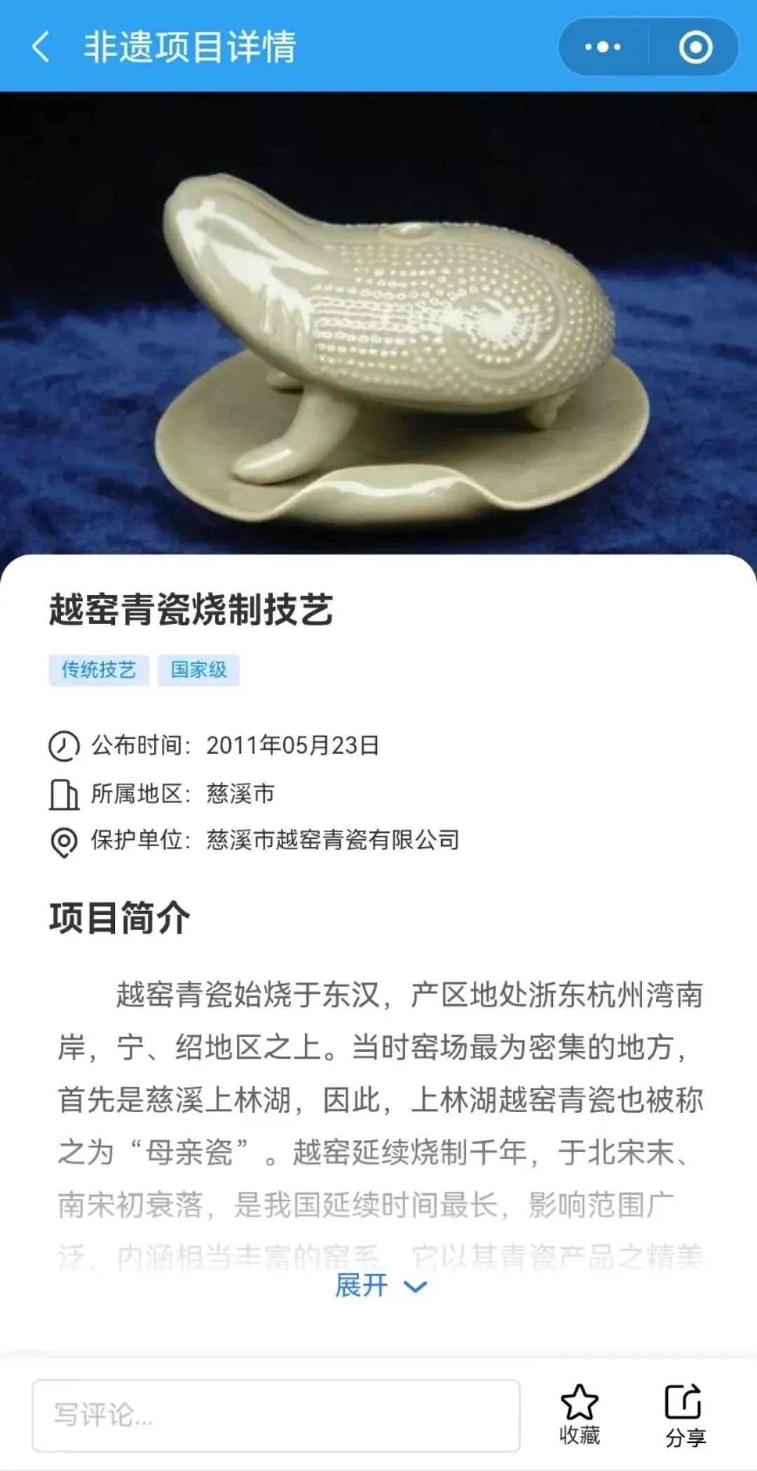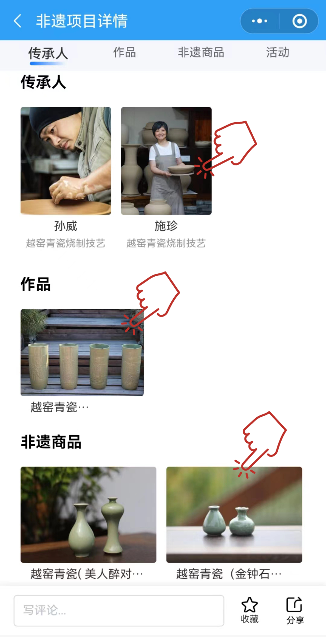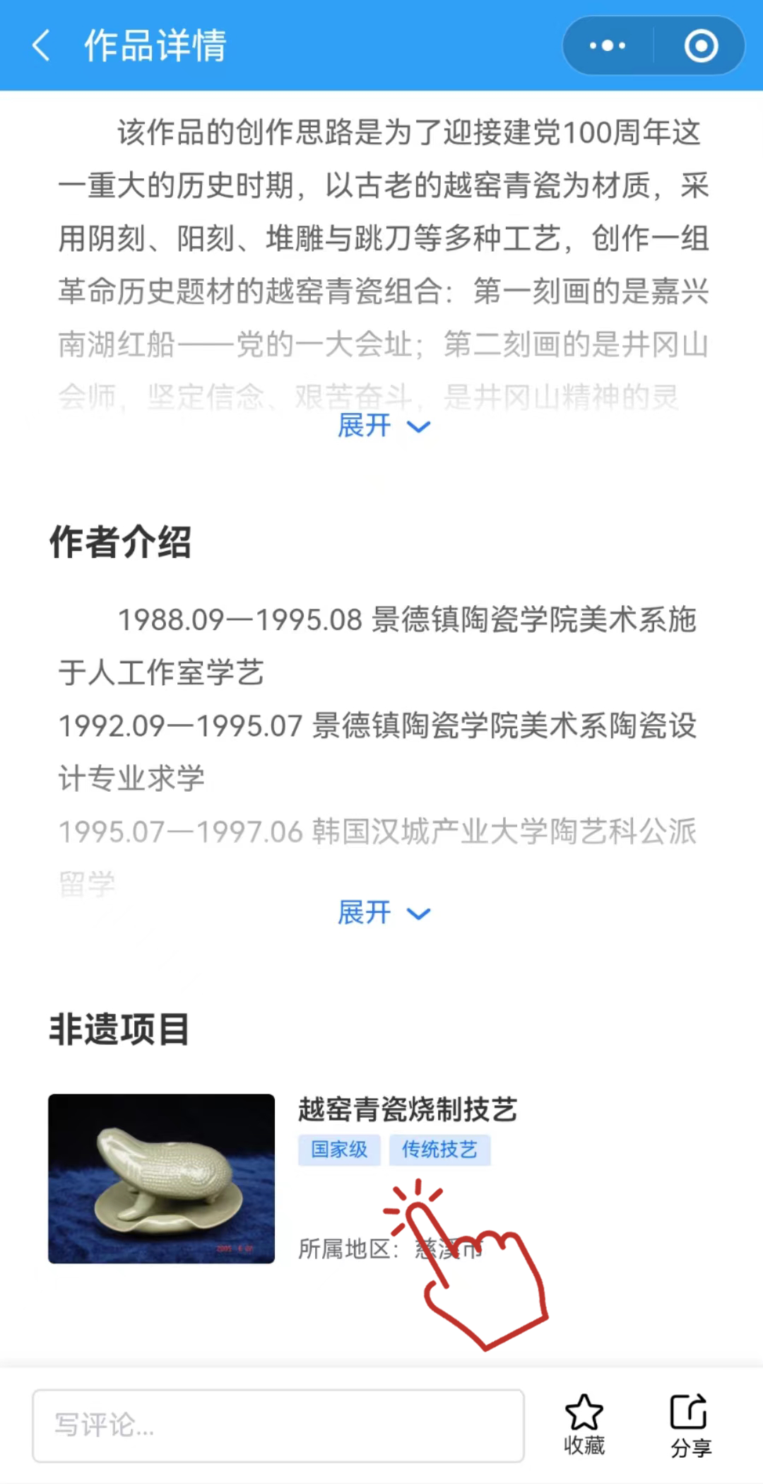 作品以卡片状显示图片、名称、材质和作者,点击具体的作品,则显示规格、创作时间、作品介绍、作者介绍等相关信息,并关联作品相关的非遗项目,点击可实现一键跳转,了解作品背后的项目知识。同样也提供评论、收藏和分享。收藏的作品可以在“我的”→“收藏”→“非遗作品”查看。