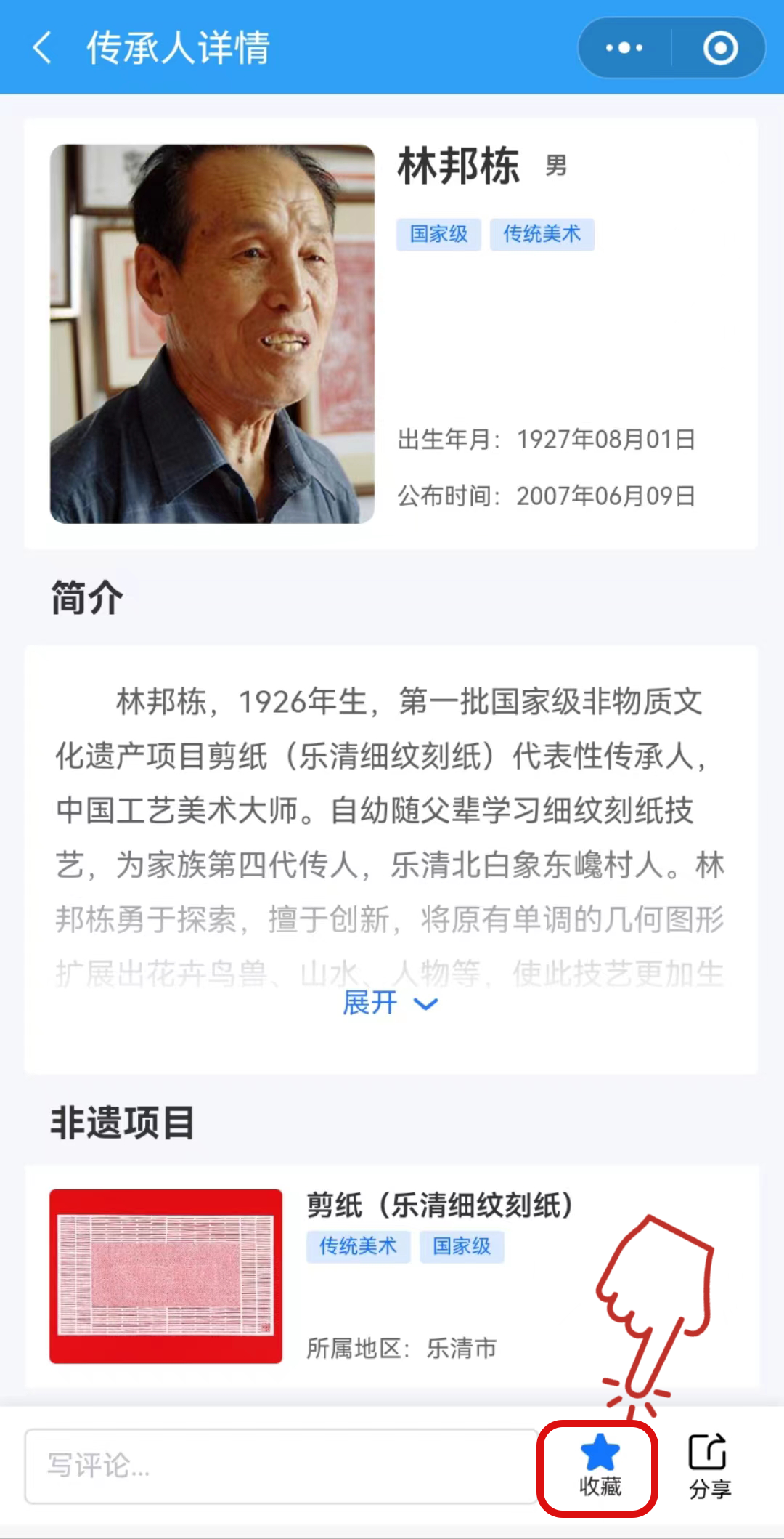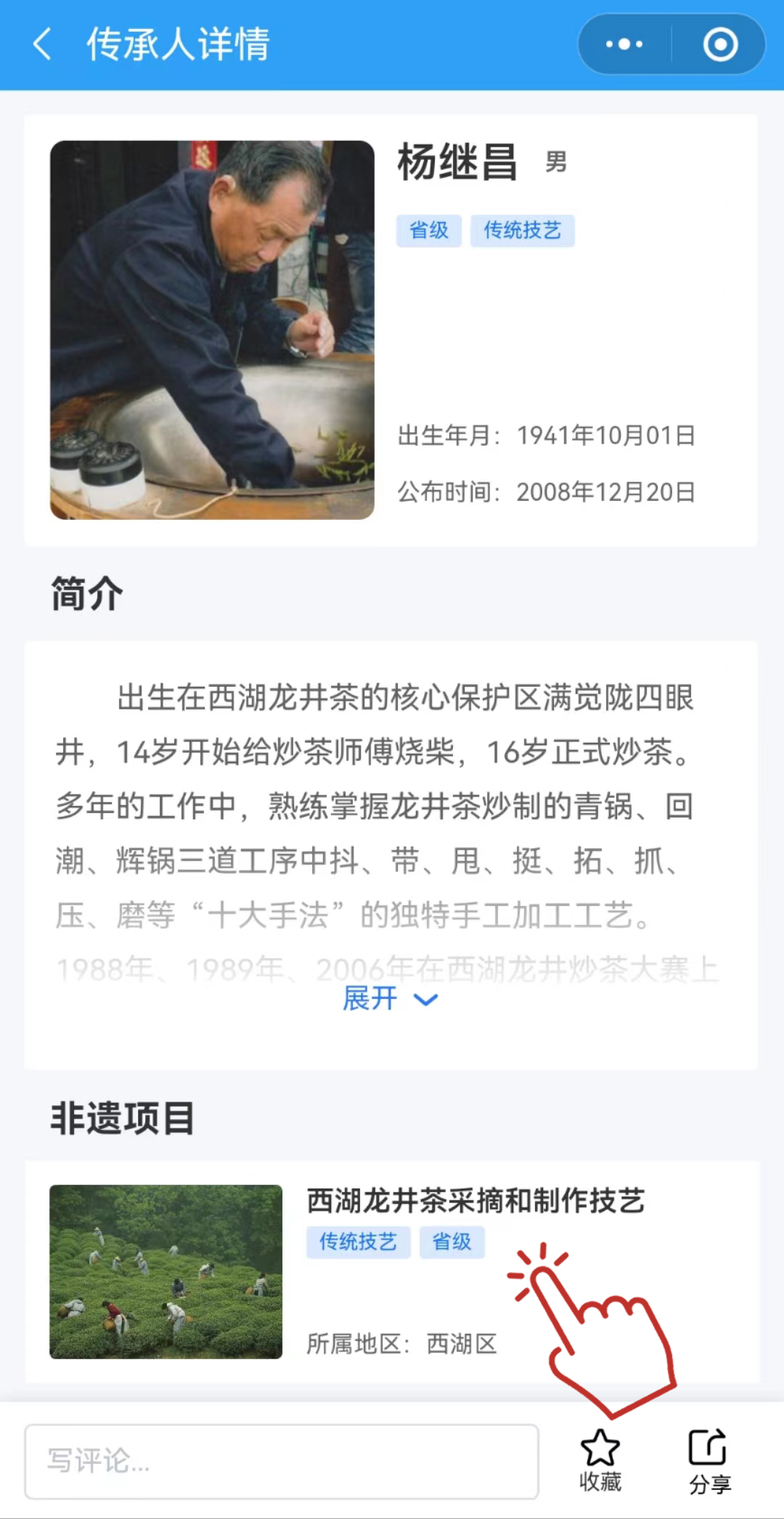 进入下级页面,可查看传承人出生年月、简介、传承的项目等详细信息,还可评论、收藏、分享,收藏的传承人可以在“我的”→“收藏”→“传承人”查看;点击相关联的传承项目,用户可点击项目条实现一键跳转。