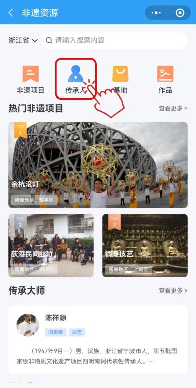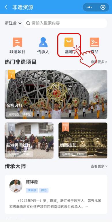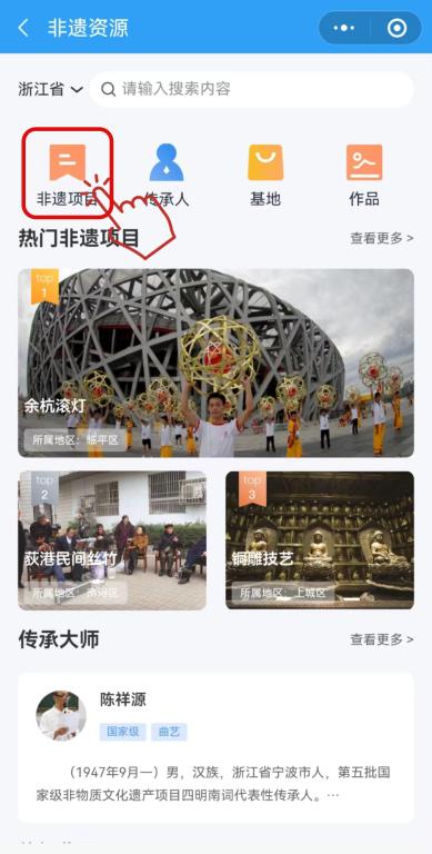 “非遗资源”板块由搜索栏、板块分区(非遗项目、传承人、基地、作品)、热门非遗项目、传承大师、热门作品构成。点击板块分区,可以针对性查阅搜索您想要了解的项目、传承人、基地、作品。
