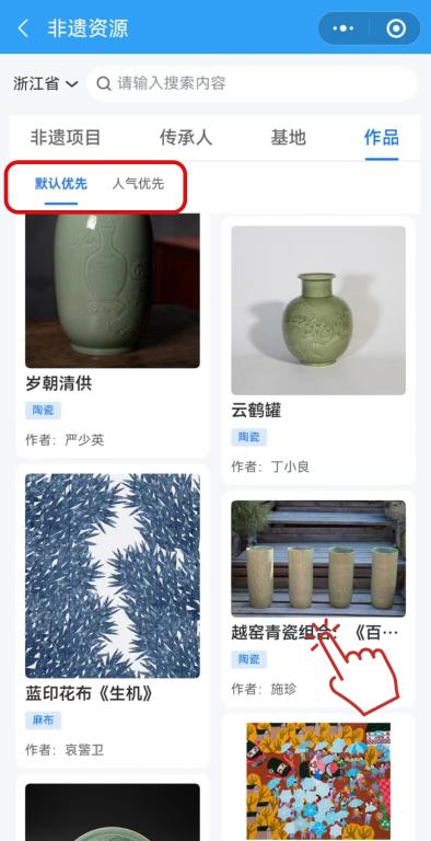 进入“非遗资源”→“作品”,点开是搜索栏可实现精准搜索,下方作品列表显示为默认排序,可另选择“人气优先”,人气高的作品还会出现在上一级页面的“热门作品”栏里。