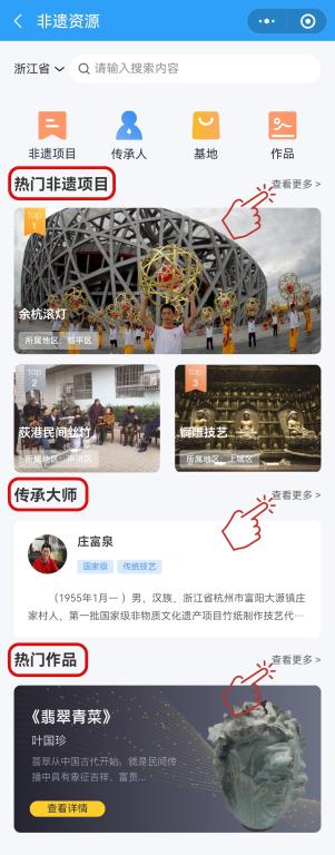 “非遗资源”→“热门作品”以banner动态轮播的形式,将非遗作品名称、作者、简介、作品等内容呈现,可点击查阅。点击【查看更多】将进入“传承人”板块。