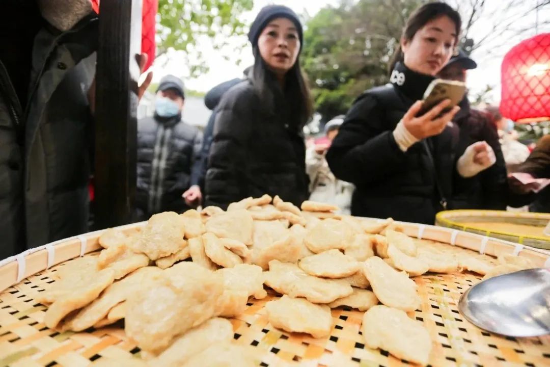 非遗美食的摊位前排着长队,“县前头汤圆”项目的摊位前,工作人员一边忙着搓制刚刚售罄的汤圆,一边叮嘱着购买的群众扫码“慢点、慢点”;九层糕、苍南鱼饼……即便提前预备了许多的存量,脱销的场面仍在一次次活动的热烈中上演。